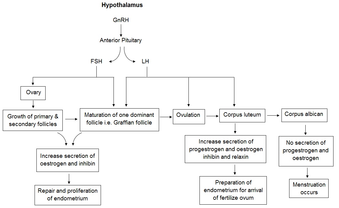 Until puberty, hypothalamus and anterior pituitary gland are under are some inhibitory influences of a higher brain centre. At puberty this inhibition is gradually withdrawn, and the hypothalamus starts secreting GnRH and under the stimulus the GnRH, pituitary gland releases FSH and LH, as well as growth promoting hormone. This growth promoting hormone causes a spurt in the height. Now we will discuss the hormonal interaction in the ovarian and uterine cycle.